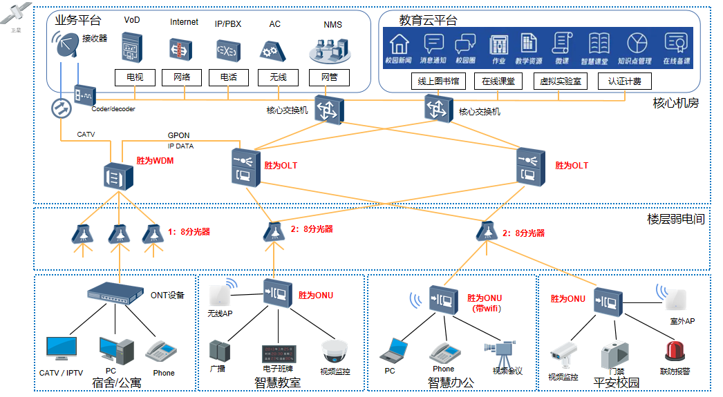 勝為智慧校園全光網(wǎng)絡(luò)(POL)解決方案是一種采用了PON網(wǎng)絡(luò)技術(shù)構(gòu)建的企業(yè)局域網(wǎng),全鏈路采用光纖作為傳輸介質(zhì),通過OLT、分光器、OUN及智能終端設(shè)備進(jìn)行靈活組網(wǎng),為用戶提供融合的數(shù)據(jù)、語音、視頻及其它弱電類業(yè)務(wù)。方案搭載了智能化運(yùn)維管理云平臺,可實(shí)現(xiàn)在web端和手機(jī)APP端進(jìn)行網(wǎng)絡(luò)設(shè)備狀態(tài)查看、監(jiān)測、維護(hù)、報(bào)告輸出等管理工作,構(gòu)建全網(wǎng)業(yè)務(wù)權(quán)限統(tǒng)一控制 實(shí)現(xiàn)對有線、無線的集中管理,簡化校園網(wǎng)絡(luò)運(yùn)維難度進(jìn)一步保障網(wǎng)絡(luò)用戶體驗(yàn)。