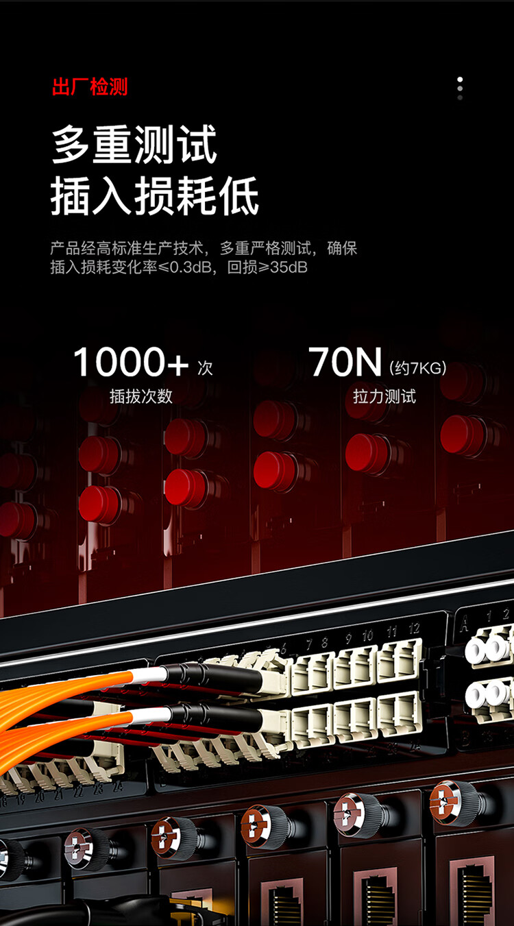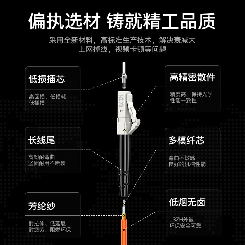 一體工藝,長線尾保護(hù),堅(jiān)固耐用不斷裂;采用高品質(zhì)陶瓷插芯,數(shù)據(jù)互換性穩(wěn)定,耐插拔次數(shù)高,性能穩(wěn)定可靠;纖芯彎曲不敏感,良好的機(jī)械性能,便于熔接光損小,傳輸快速穩(wěn)定;環(huán)保低煙無鹵材質(zhì)外被,使用時(shí)間長,耐磨損抗腐蝕,環(huán)保無異味;多重測試,插入損耗低,產(chǎn)品經(jīng)高標(biāo)準(zhǔn)生產(chǎn)技術(shù),多重嚴(yán)格測試,確保插入損耗變化率<0.30dB,回?fù)p≥35dB