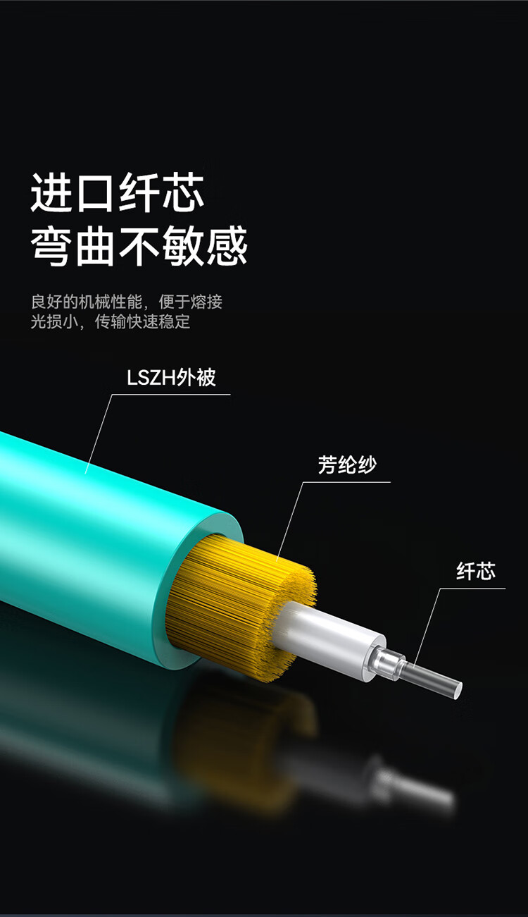 產(chǎn)品選用全新高品質(zhì)陶瓷插芯,性能穩(wěn)定高速可靠,全新低煙無鹵外被,防拉抗搜性強(qiáng),低碳環(huán)保。纖芯彎曲不敏感,原裝散件,耐高溫,環(huán)保堅(jiān)固耐用,不變形不斷裂防脫落。