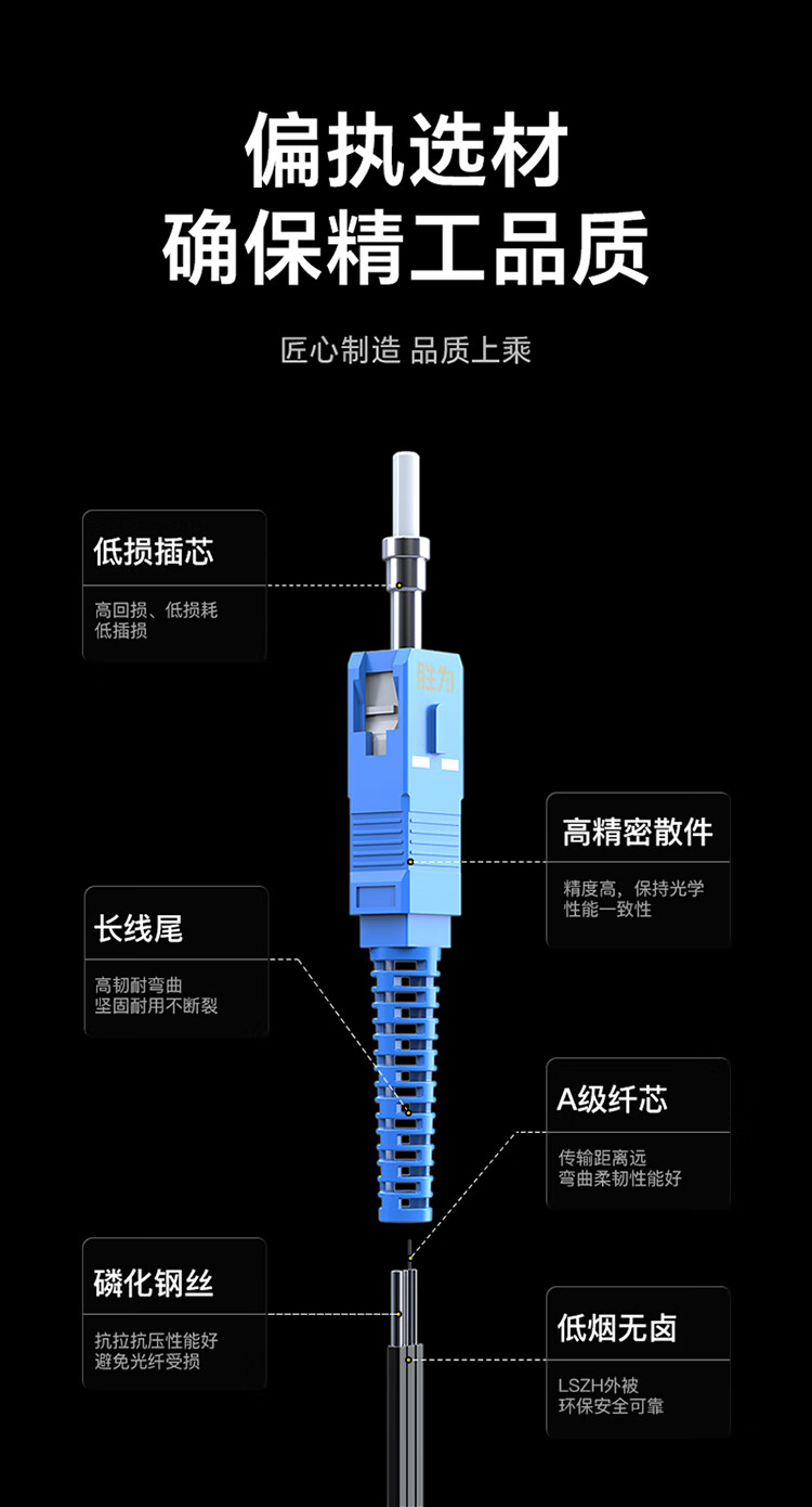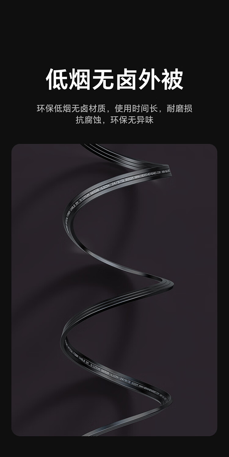 高精密散件,精度高,保持光學性能一致性;長線尾,高韌耐彎曲,堅固耐用不斷裂;A級纖芯,傳輸距離遠,彎曲柔韌性能好;磷化鋼絲,抗拉抗壓性能好,避免光纖受損;低煙無鹵外被,使用時間長,環(huán)保安全可靠;凹型槽設計,方便易剝離,方便接續(xù),提高工作效率。