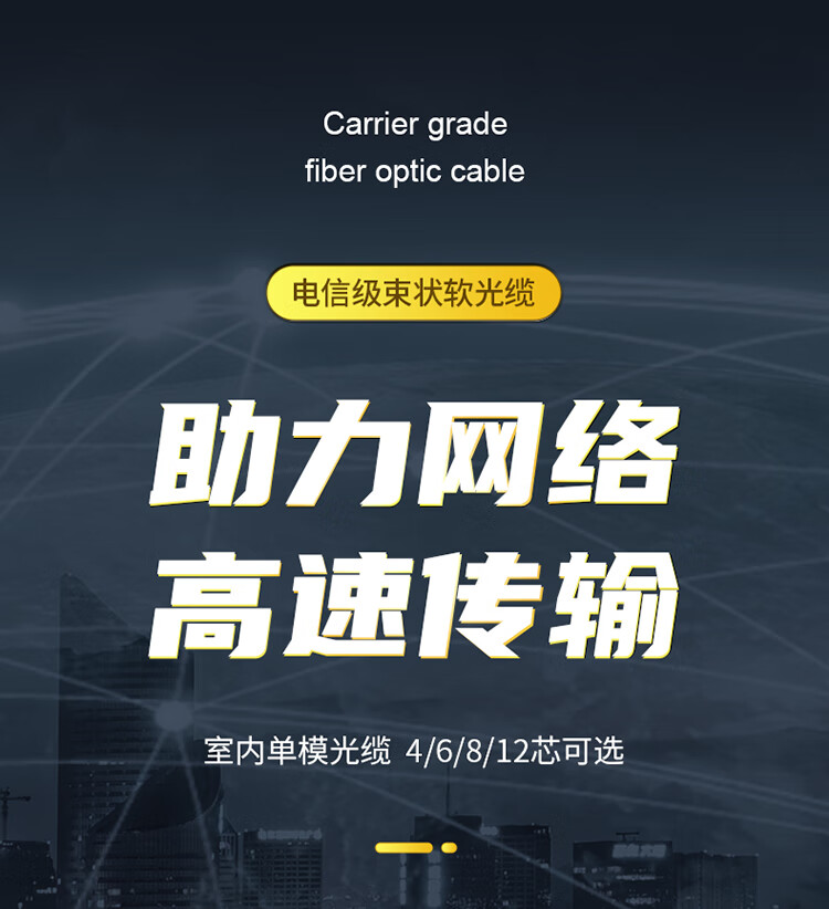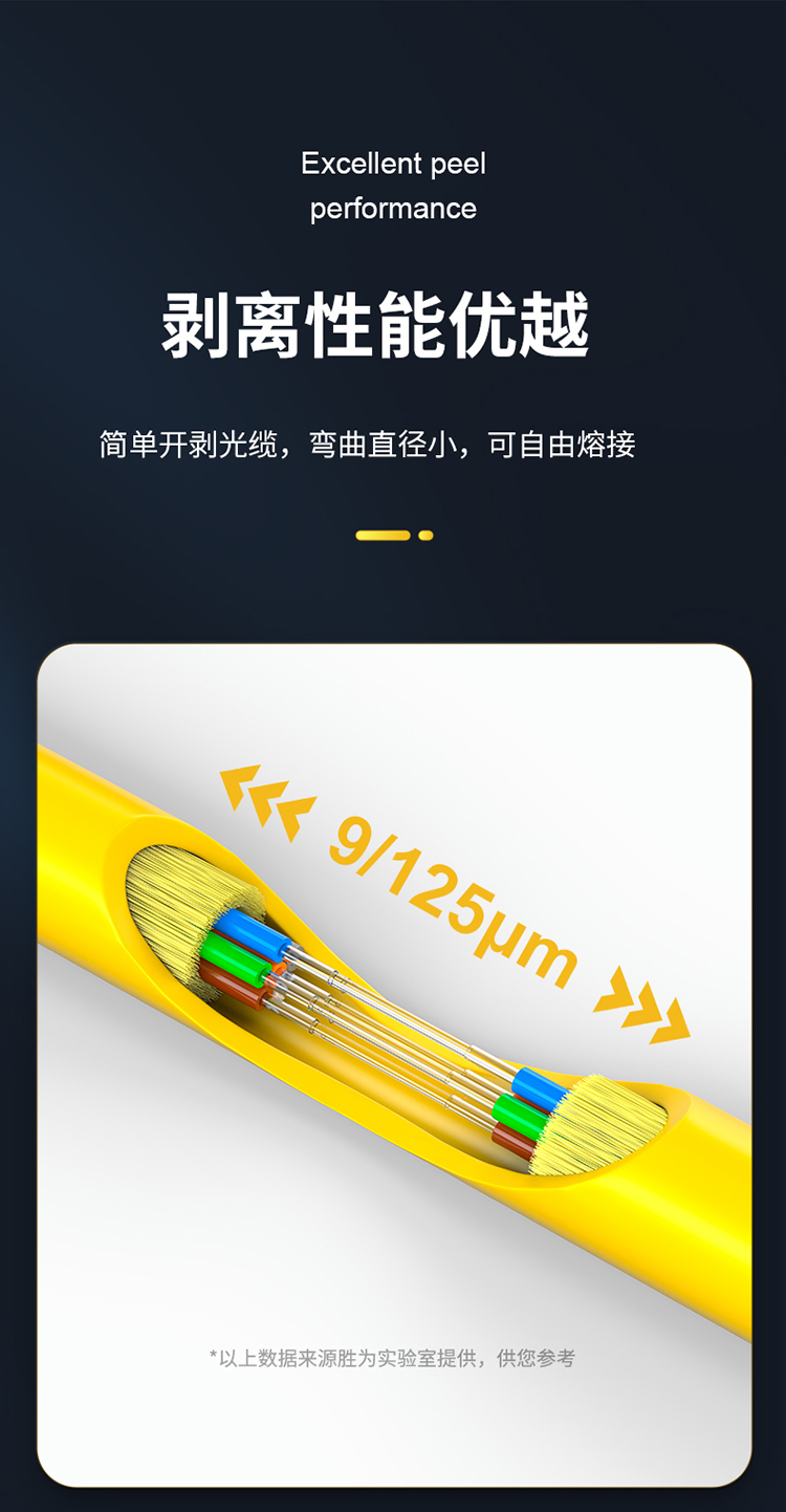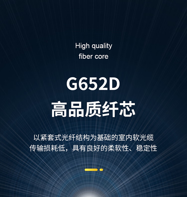G652D高品質纖芯,以緊套式光纖結構為基礎的室內軟光纜,傳輸損耗低,具有良好的柔軟性、穩(wěn)定性。剝離性能優(yōu)越,簡單開剝光纜,彎曲直徑小,可自由熔接抗拉伸。光纜抗拉性、扭曲性、抗彎性好,能在緊湊型的空間中安裝。環(huán)保低煙無鹵外被為光纜提供了阻燃性能,環(huán)保安全,保密性能好,可用于特殊環(huán)境。