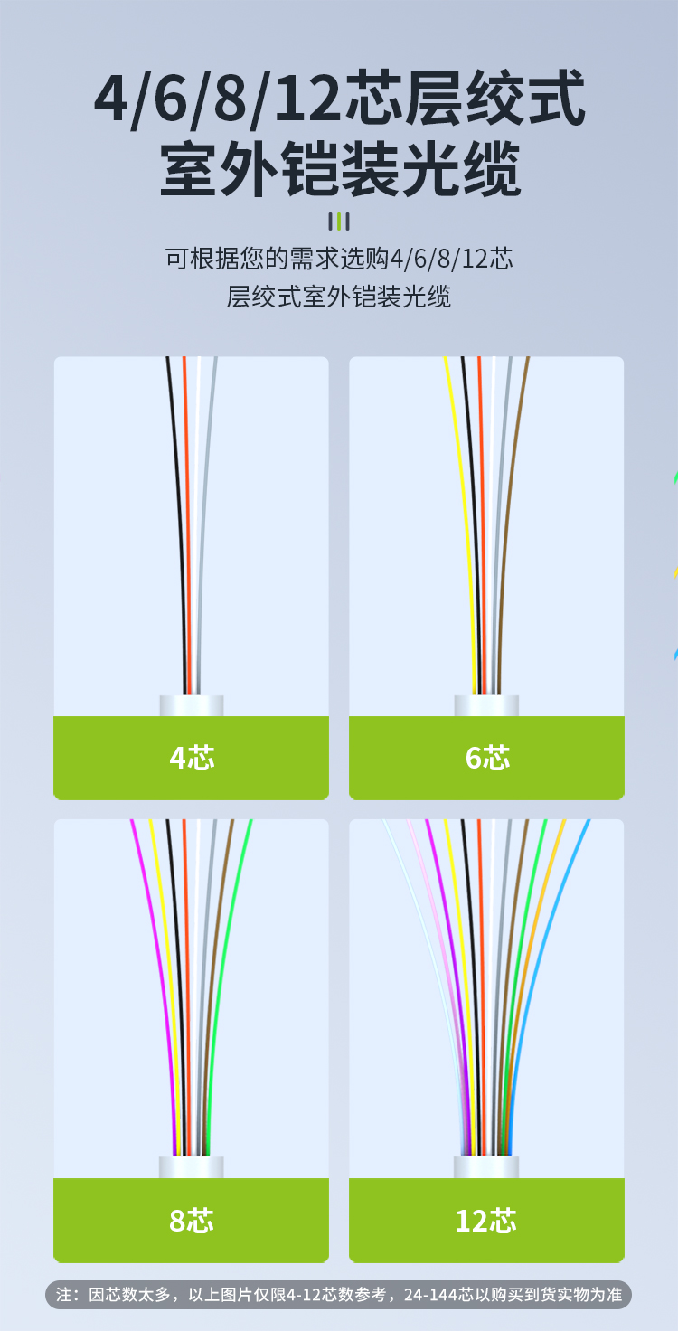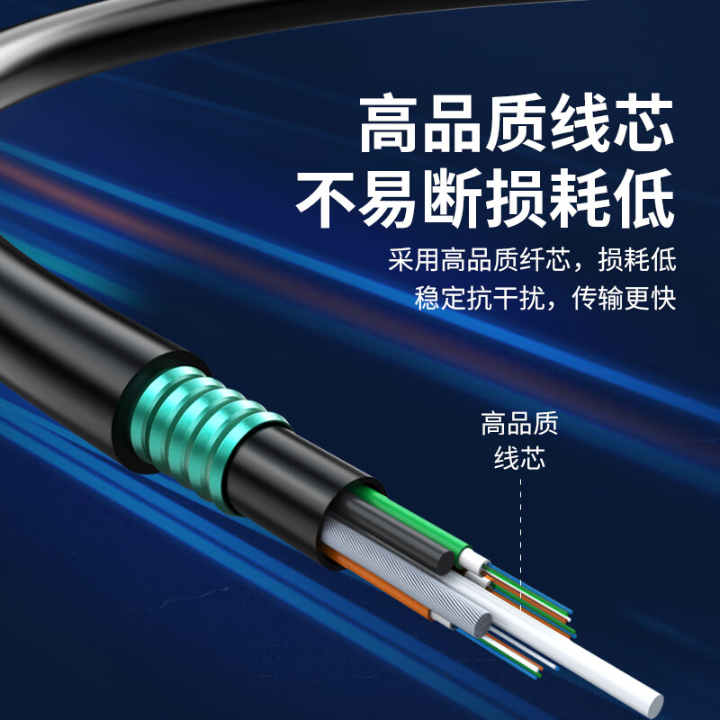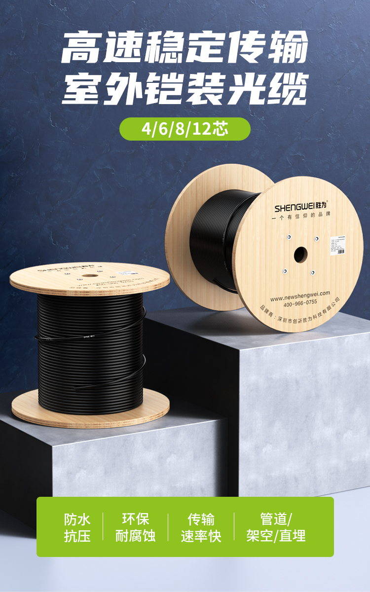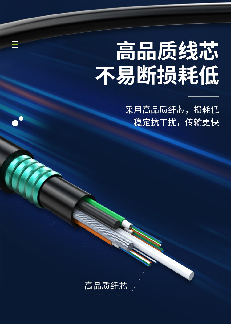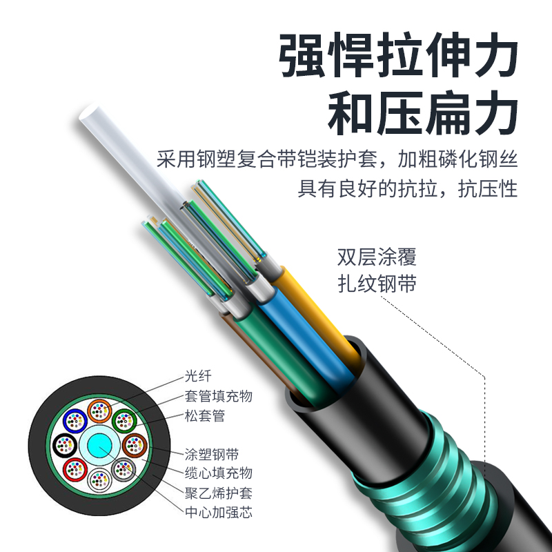 采用環(huán)保聚乙烯 (HDPE)黑色外被,添加UV防曬材料,耐高低溫,不易老化。高品質(zhì)線芯不易斷損耗低,采用高品質(zhì)纖芯, 損耗低穩(wěn)定抗干擾, 傳輸更快。足芯足米應用廣泛,滿足不同環(huán)境的工作需求。強悍拉伸力和壓扁力,采用鋼塑復合帶鎧裝護套, 加粗磷化鋼絲具有良好的抗拉, 抗壓性。