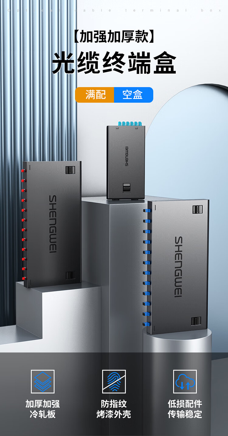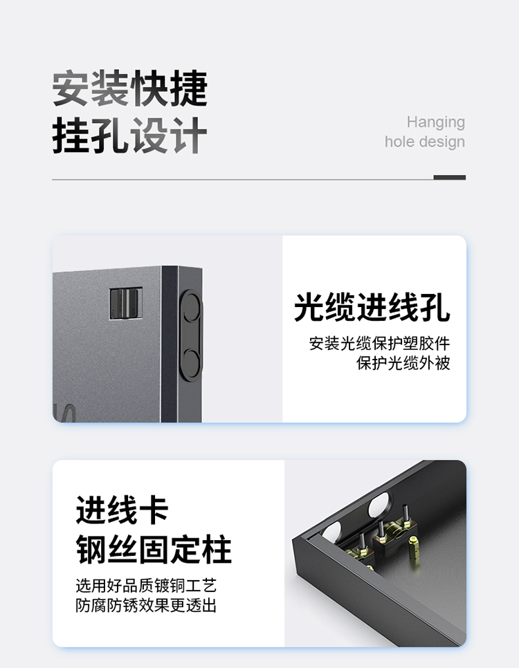 加厚加強冷軋板材質, 抗壓耐沖擊持久使用不變形, 承重力強。采用黑色環(huán)氧靜電噴塑烤漆工藝, 高度耐磨耐腐蝕不沾指紋, 質感好。采用低損配件, 減少信號傳輸損耗;卡扣和螺絲采用內凹設計, 堆疊平穩(wěn), 節(jié)省空間;安裝快捷,掛孔設計;熔接盤內部結構堅固緊密, 安裝光纜/光纖條理分配盤纖與固定, 有效保護光纖不受損傷以及控制彎曲半徑保證信號穩(wěn)定傳輸。