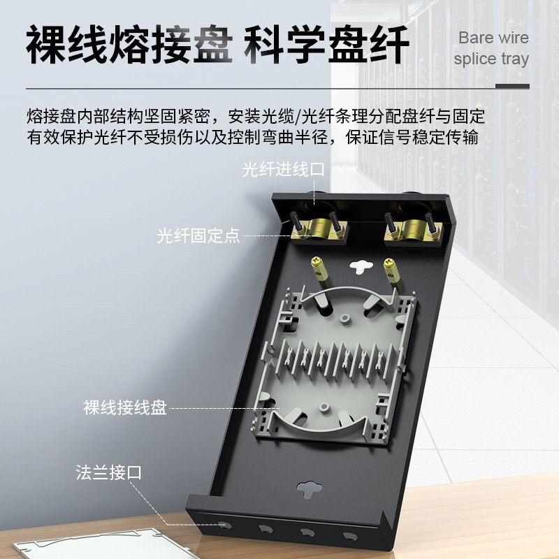 加厚加強冷軋板材質, 抗壓耐沖擊持久使用不變形, 承重力強。采用黑色環(huán)氧靜電噴塑烤漆工藝, 高度耐磨耐腐蝕不沾指紋, 質感好。采用低損配件, 減少信號傳輸損耗;卡扣和螺絲采用內凹設計, 堆疊平穩(wěn), 節(jié)省空間;安裝快捷,掛孔設計;熔接盤內部結構堅固緊密, 安裝光纜/光纖條理分配盤纖與固定, 有效保護光纖不受損傷以及控制彎曲半徑保證信號穩(wěn)定傳輸。