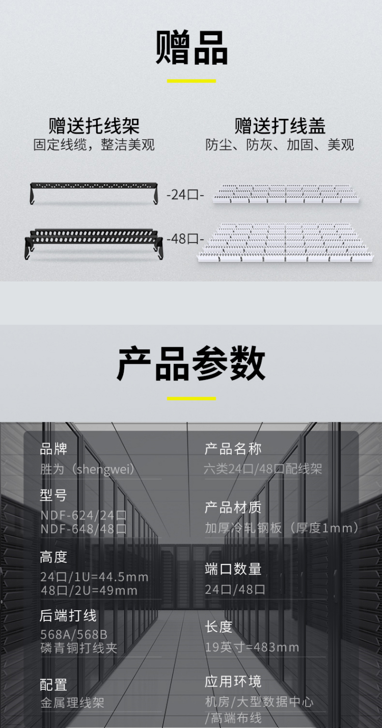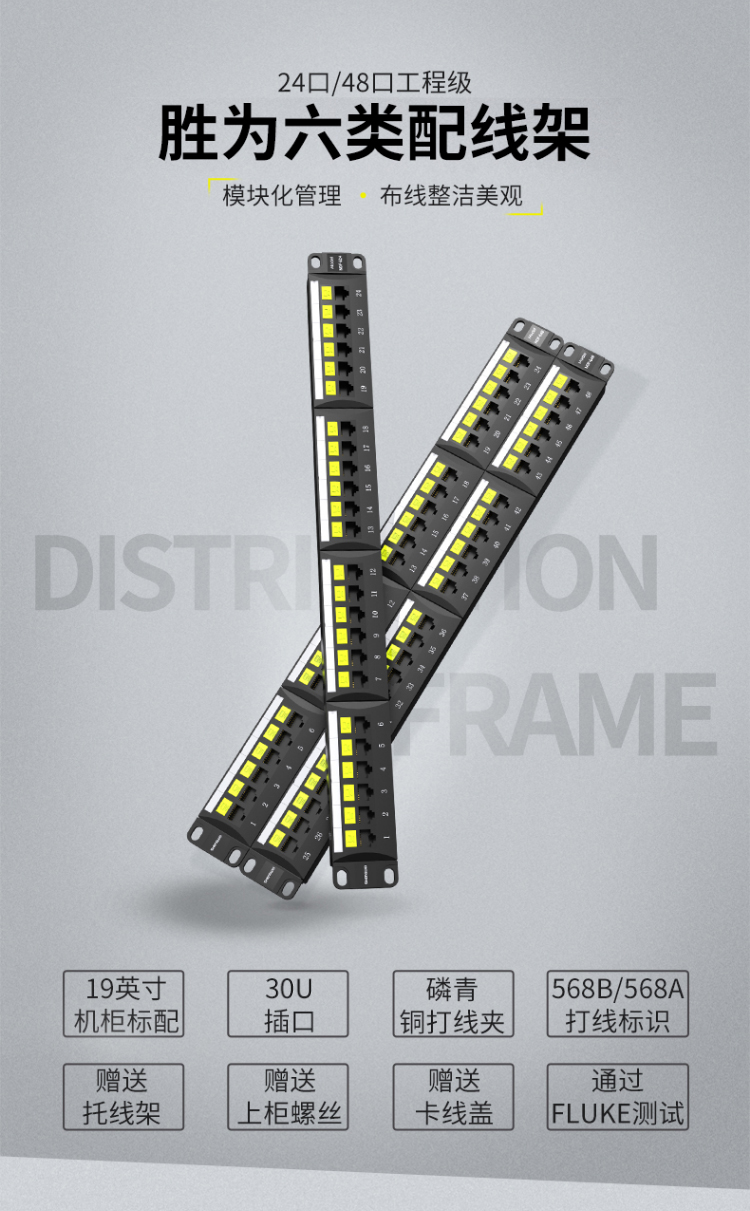 勝為六類配線架,模塊化管理,材質(zhì)使用上等冷軋鋼板,一體成型,堅(jiān)固耐用,(19英寸機(jī)柜通用,24口高度1U,48口高度2U)