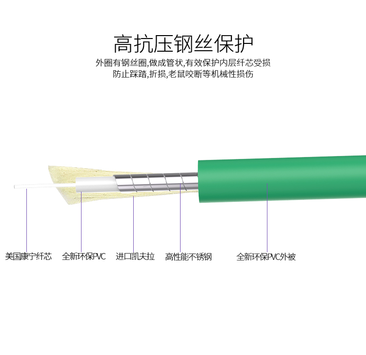 高抗壓鋼絲保護(hù),外圈有鋼絲圈,做成管狀,有效保護(hù)內(nèi)層纖芯受損,防止踩踏、折損、老鼠咬斷等機(jī)械性損傷。