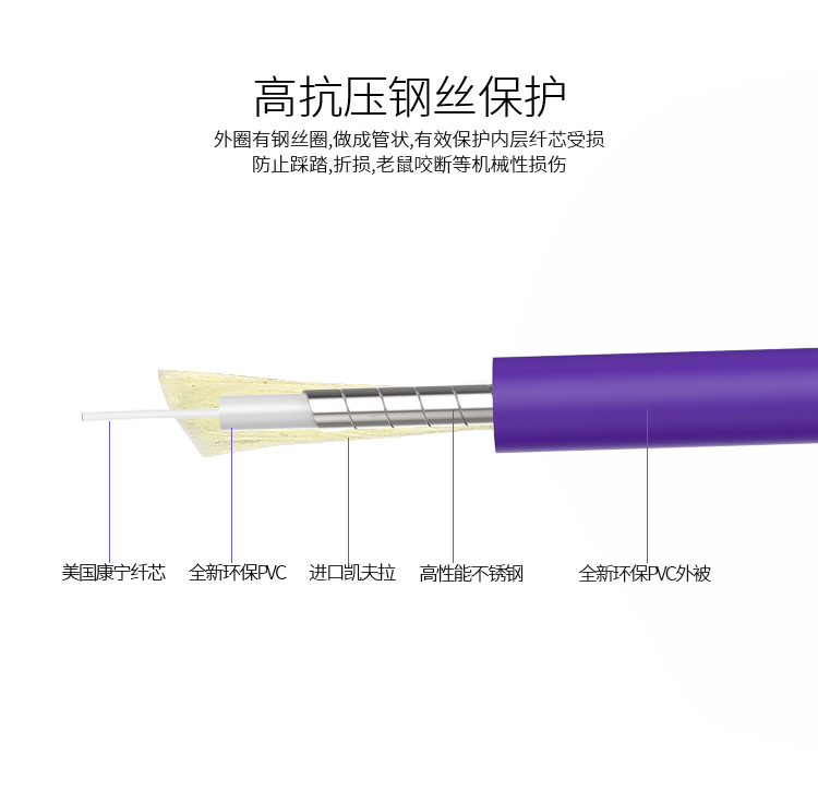 高抗壓鋼絲保護(hù),外圈有鋼絲圈,做成管狀,有效保護(hù)內(nèi)層纖芯受損,防止踩踏、折損、老鼠咬斷等機(jī)械性損傷。