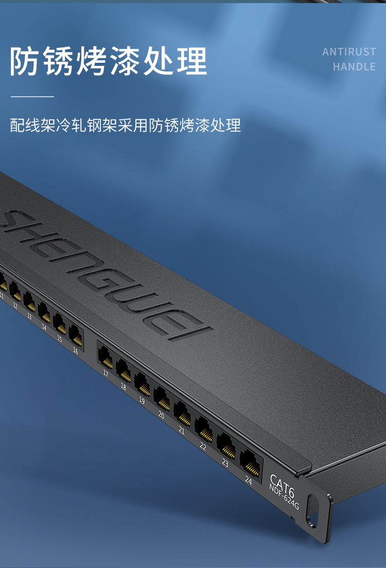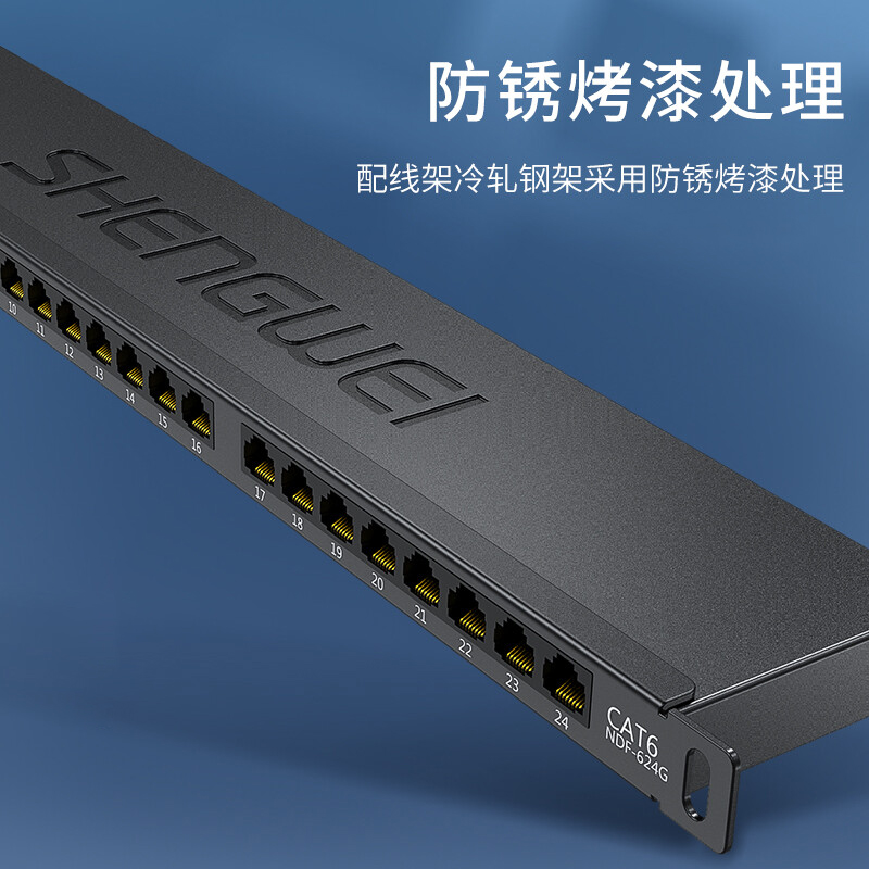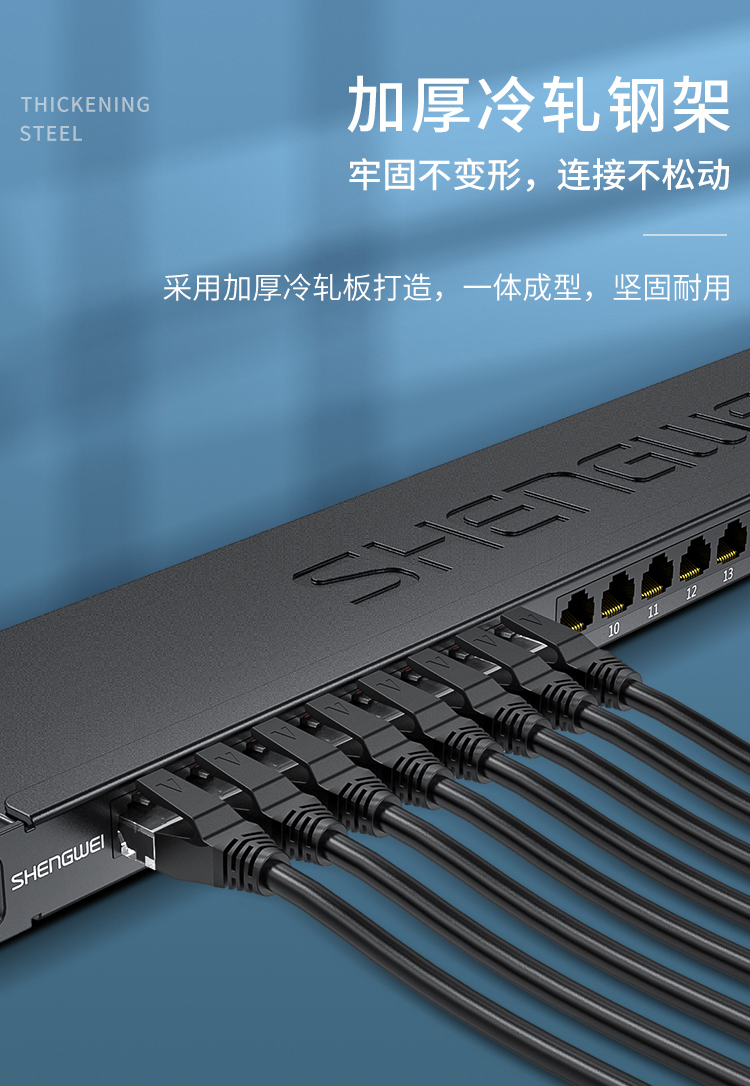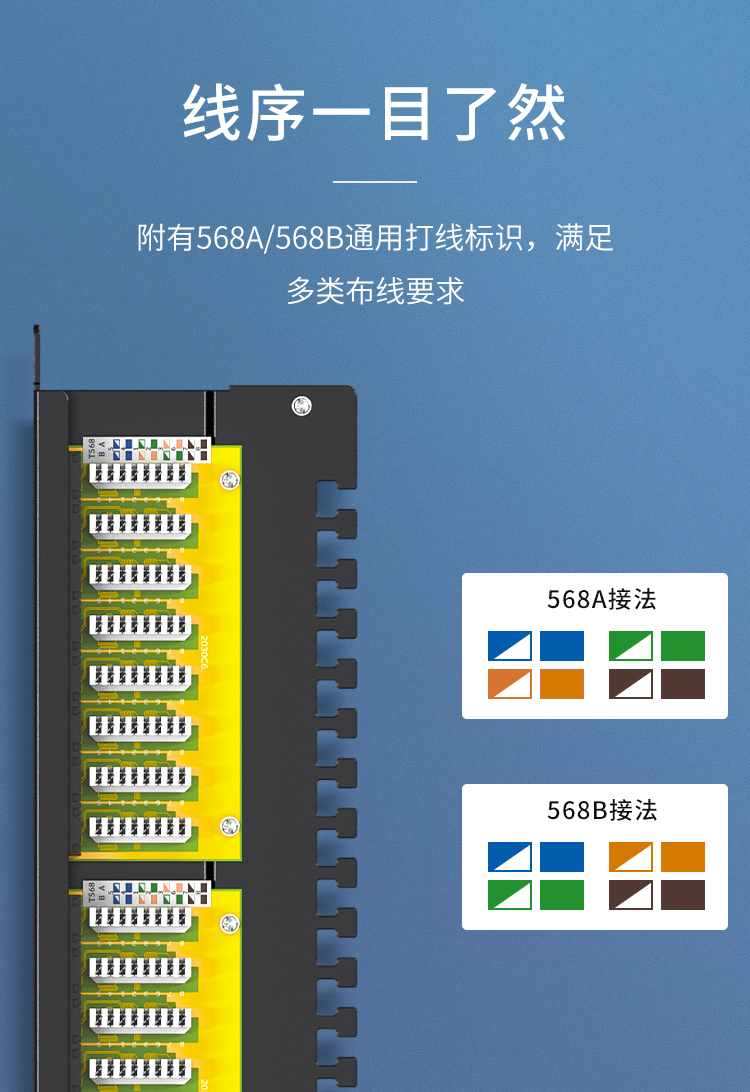 加厚冷軋鋼架,牢固不變形,連接不松動(dòng),采用加厚冷軋板打造,一體成型,堅(jiān)固耐用,附有T568A/T568B通用打線標(biāo)識(shí),滿足多類布線要求。