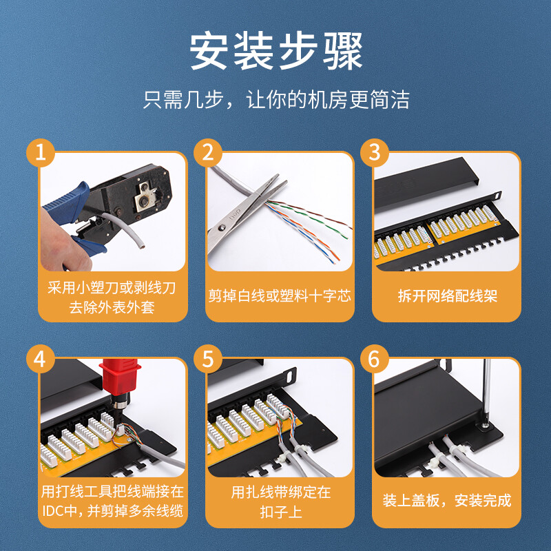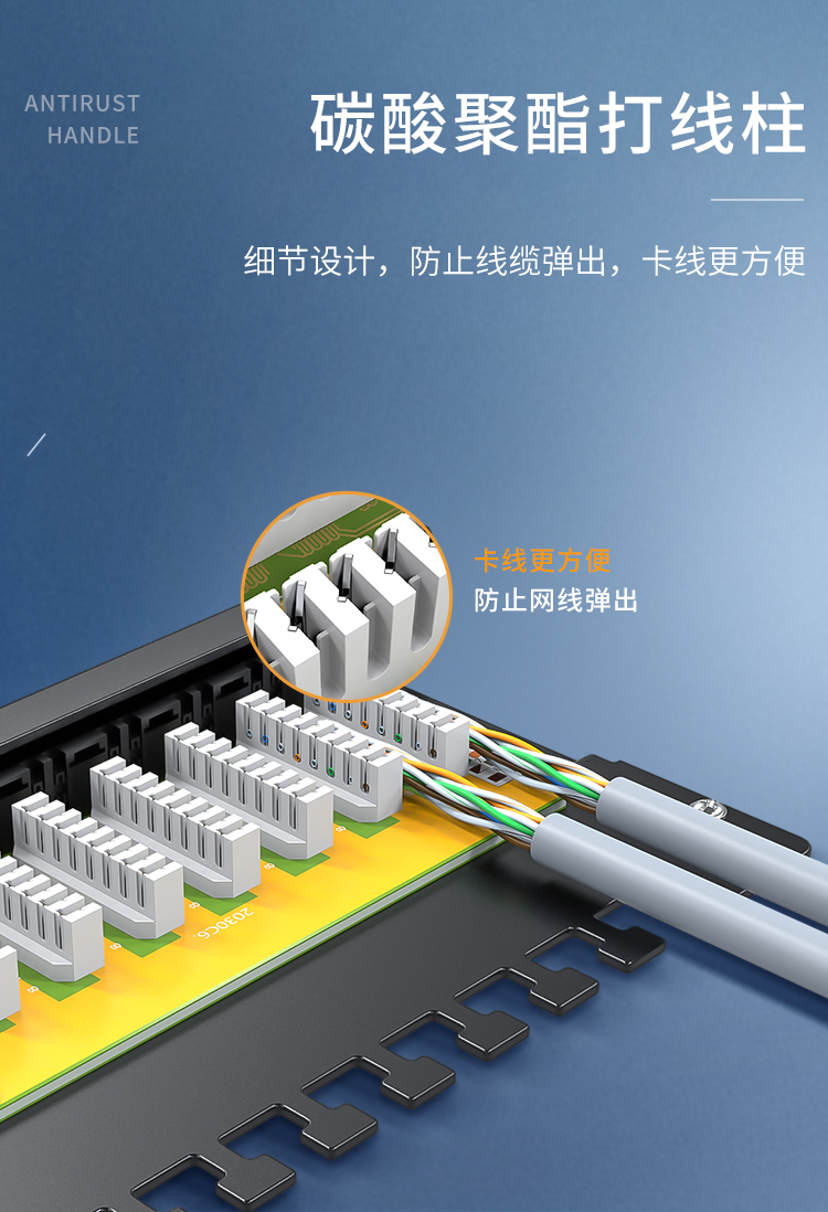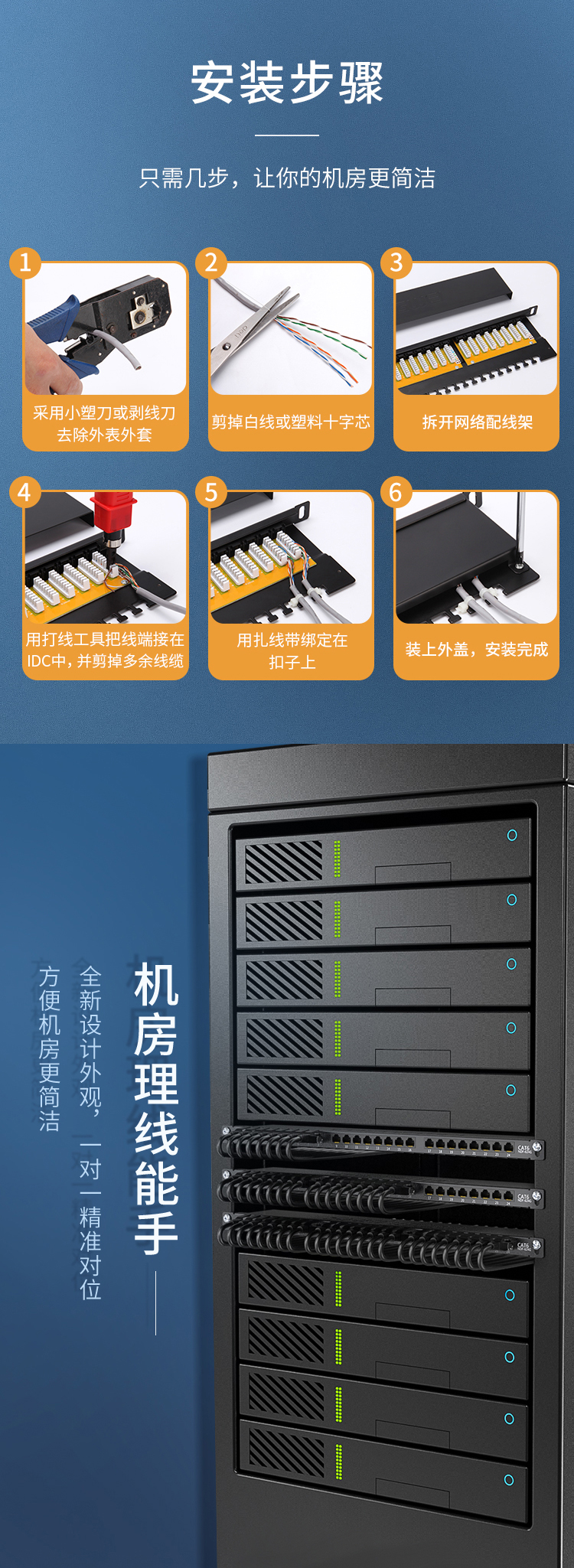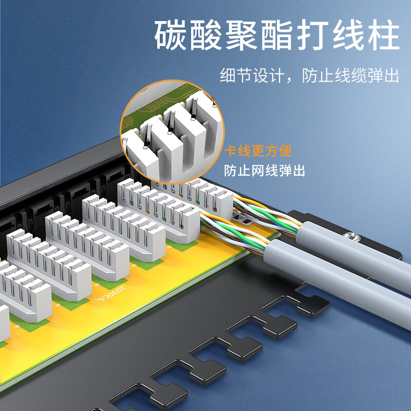 加厚冷軋鋼架,牢固不變形,連接不松動(dòng),采用加厚冷軋板打造,一體成型,堅(jiān)固耐用,附有T568A/T568B通用打線標(biāo)識(shí),滿足多類布線要求。
