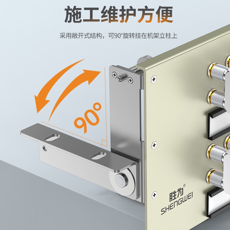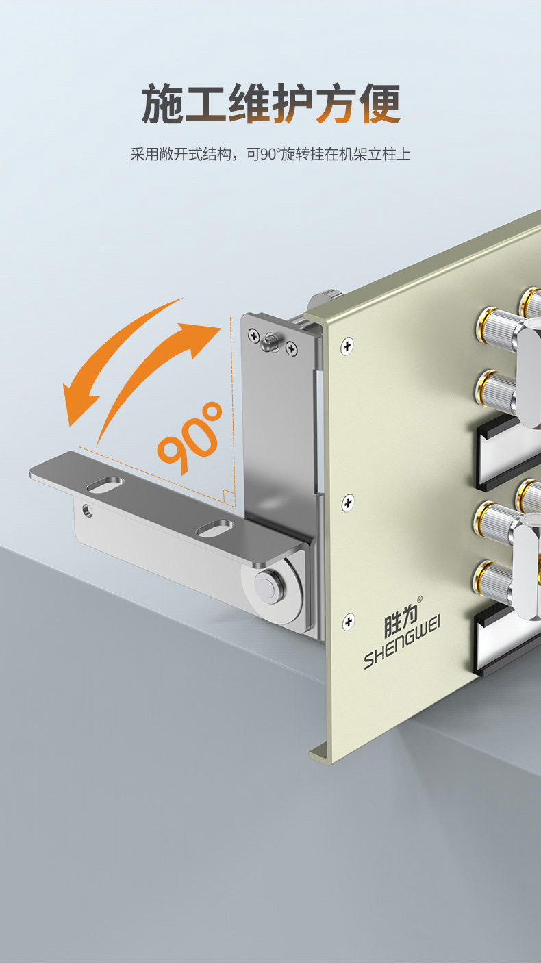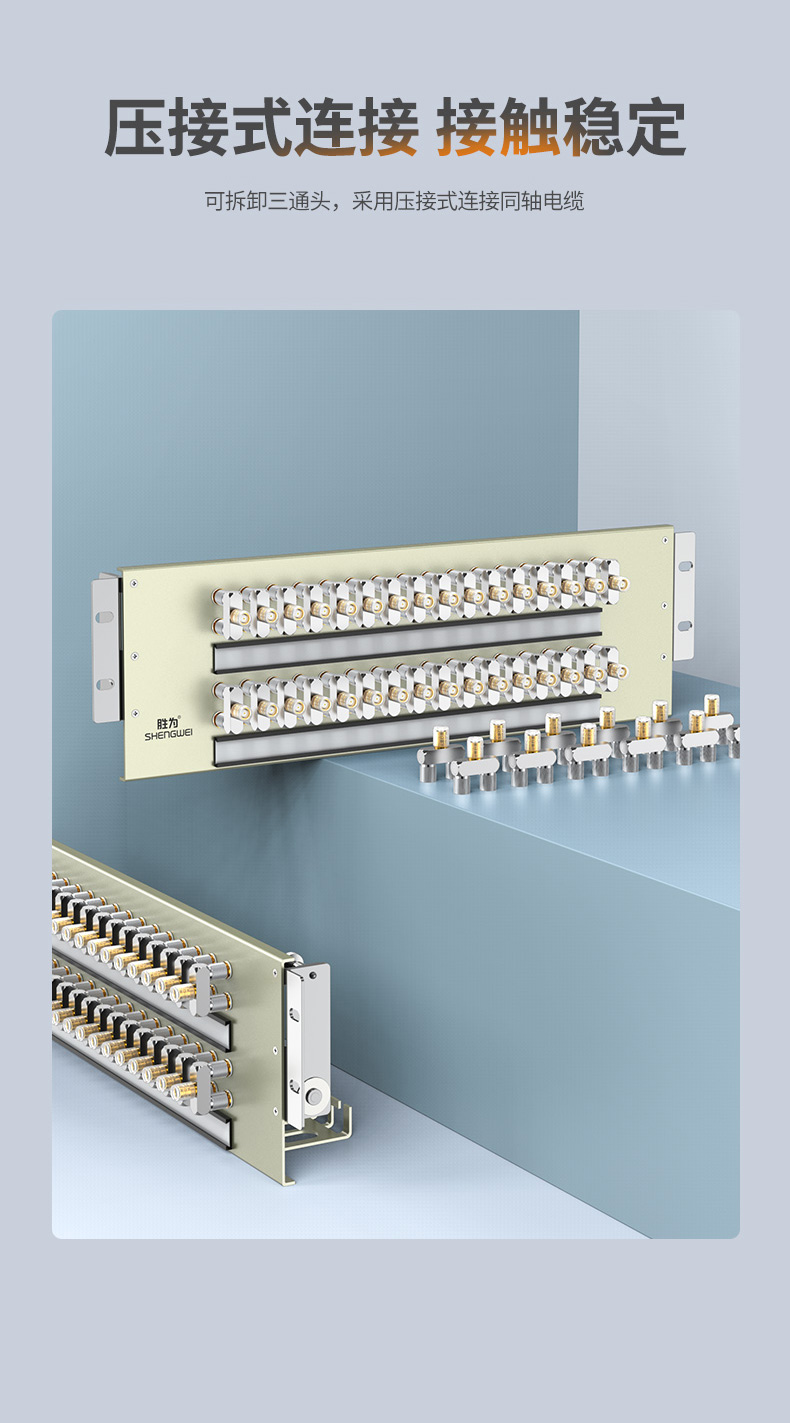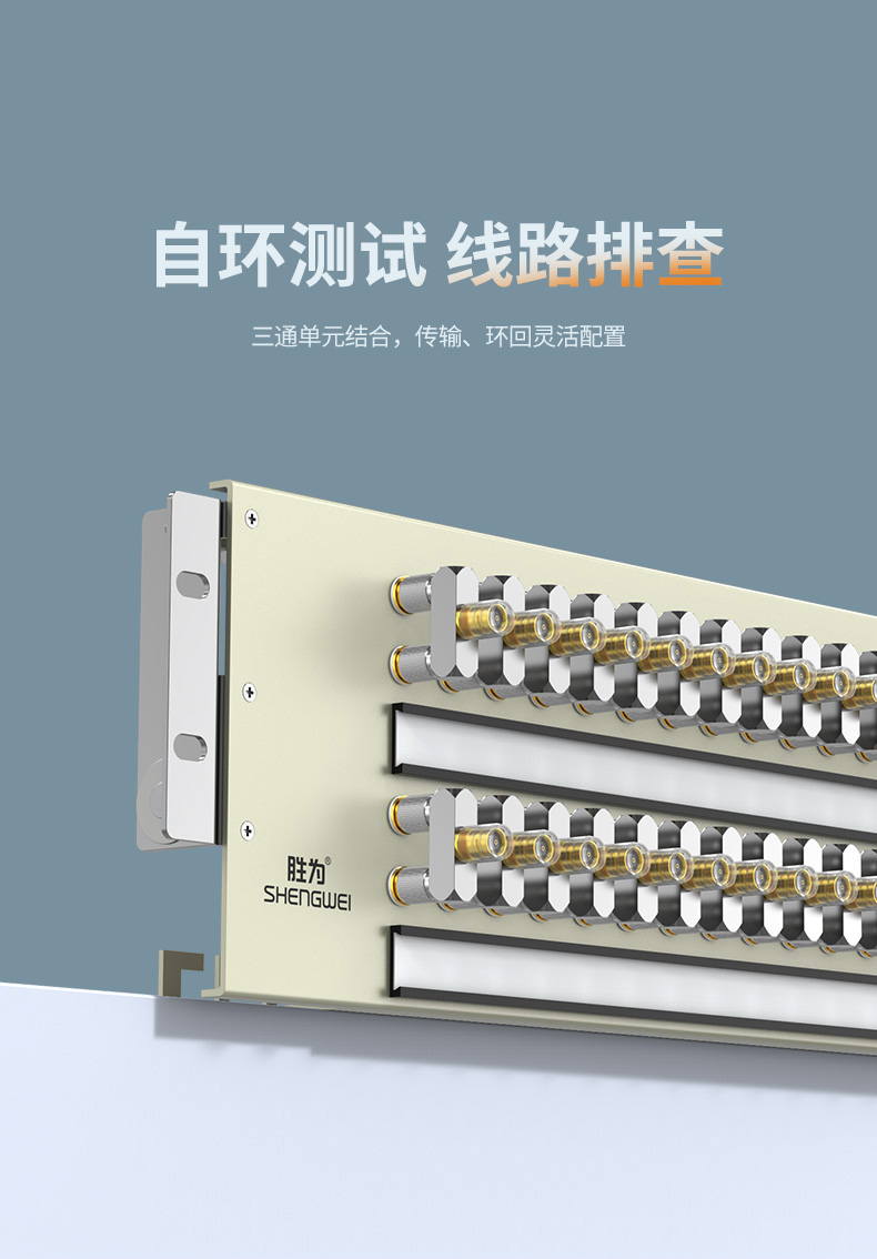 采用敞開式結構,可90°旋轉掛在機架立柱上,可拆卸三通頭,采用壓接式連接同軸電纜,三通單元結合,傳輸、環(huán)回靈活配置。