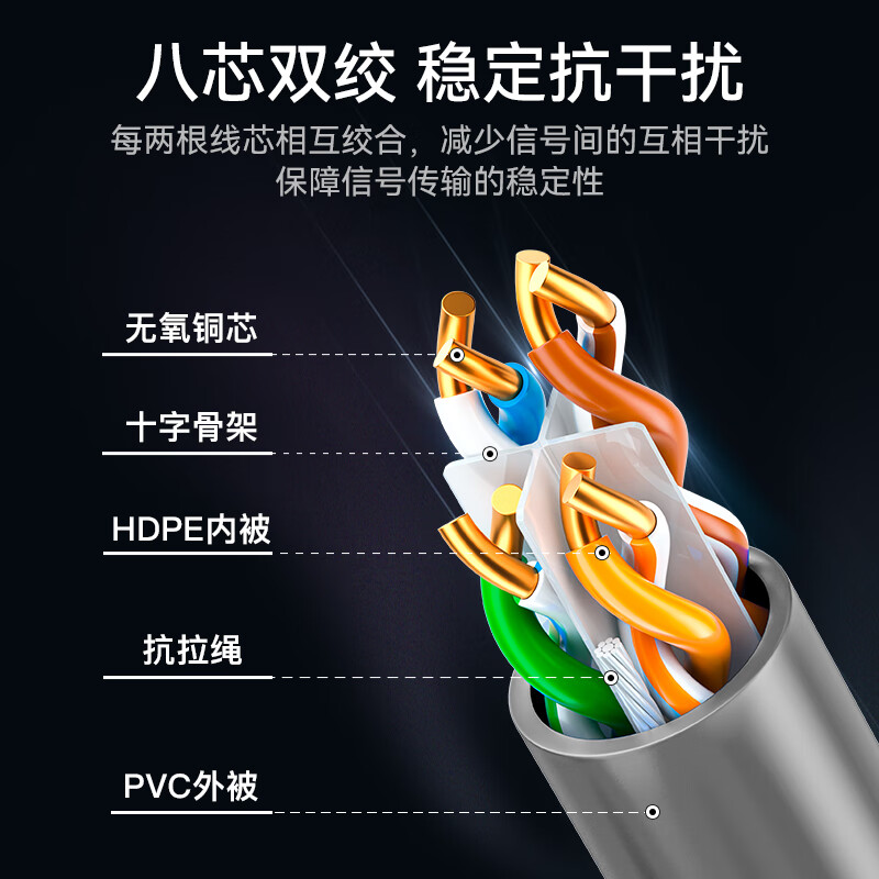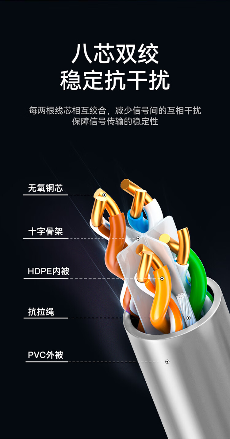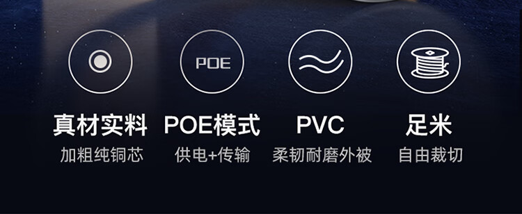 智能主動(dòng)放線,芯線押出采用主動(dòng)放線技術(shù),保障銅線直徑的一致性,從而更好控制導(dǎo)體電阻的一致性,使信號(hào)傳輸更均勻穩(wěn)定;無氧銅芯,嚴(yán)選24AWG標(biāo)準(zhǔn)無氧銅芯,傳輸阻抗低;采用PVC環(huán)保外被,柔韌抗老化;八芯雙絞,穩(wěn)定抗干擾,每?jī)筛€芯相互絞合,減少信號(hào)間的互相干擾,保障信號(hào)傳輸?shù)姆€(wěn)定性,支持監(jiān)控,POE供電,無需多余布線,一根網(wǎng)線解決監(jiān)控供電問題。