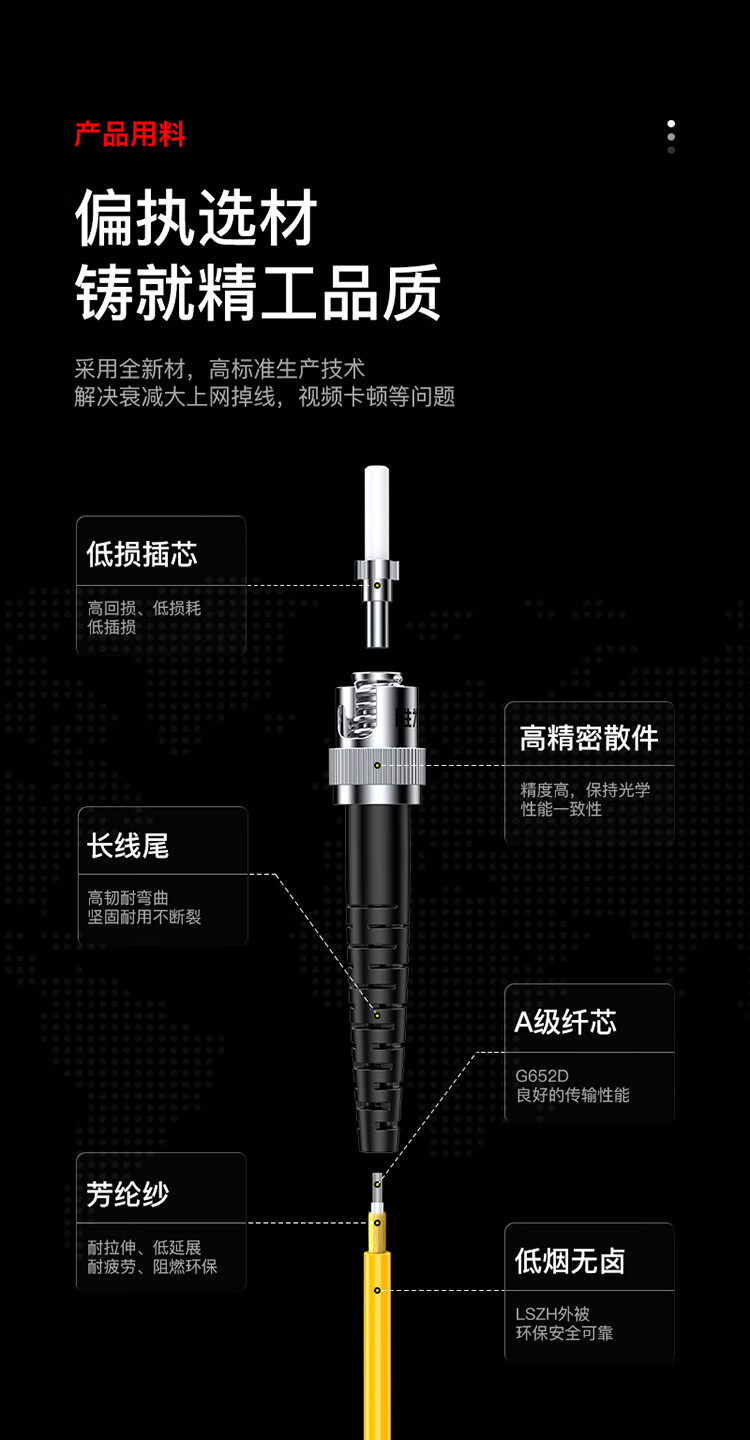 長(zhǎng)線尾保護(hù),堅(jiān)固耐用不斷裂;采用全新高品質(zhì)陶瓷插芯,數(shù)據(jù)互換性穩(wěn)定;耐插拔次數(shù)高,性能穩(wěn)定可靠;纖芯彎曲不敏感,良好的機(jī)械性能,便于熔接光損小,傳輸快速穩(wěn)定;環(huán)保低煙無(wú)鹵材質(zhì)外被,使用時(shí)間長(zhǎng),耐磨損抗腐蝕,環(huán)保無(wú)異味;多重測(cè)試,插入損耗低,產(chǎn)品經(jīng)高標(biāo)準(zhǔn)生產(chǎn)技術(shù),多重嚴(yán)格測(cè)試,確保插入損耗變化率<0.30dB,回?fù)p≥50dB。