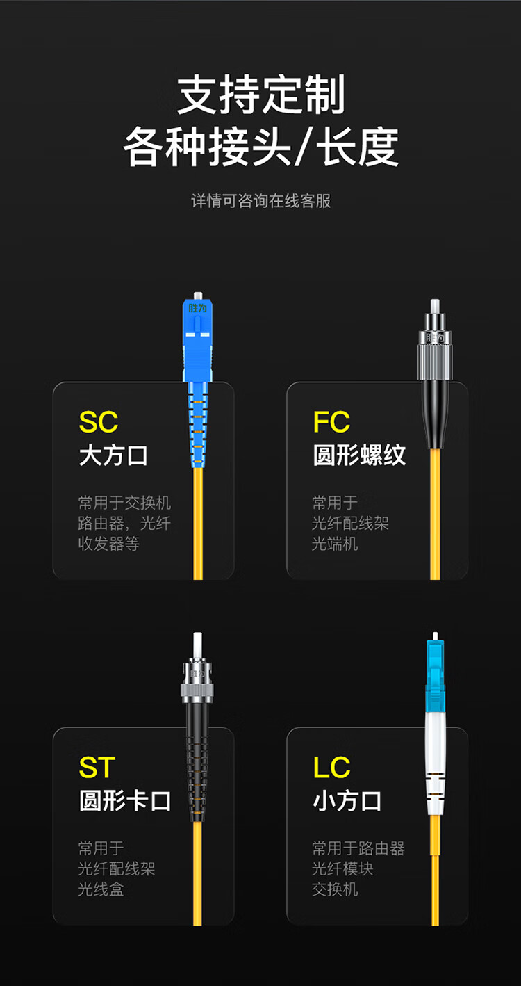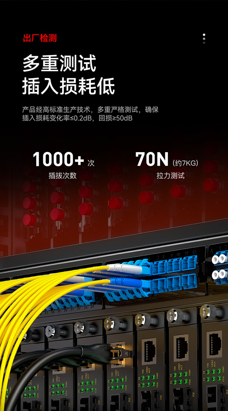 長線尾保護,堅固耐用不斷裂;采用全新高品質(zhì)陶瓷插芯,數(shù)據(jù)互換性穩(wěn)定;耐插拔次數(shù)高,性能穩(wěn)定可靠;纖芯彎曲不敏感,良好的機械性能,便于熔接光損小,傳輸快速穩(wěn)定;環(huán)保低煙無鹵材質(zhì)外被,使用時間長,耐磨損抗腐蝕,環(huán)保無異味;多重測試,插入損耗低,產(chǎn)品經(jīng)高標準生產(chǎn)技術(shù),多重嚴格測試,確保插入損耗變化率<0.30dB,回損≥50dB