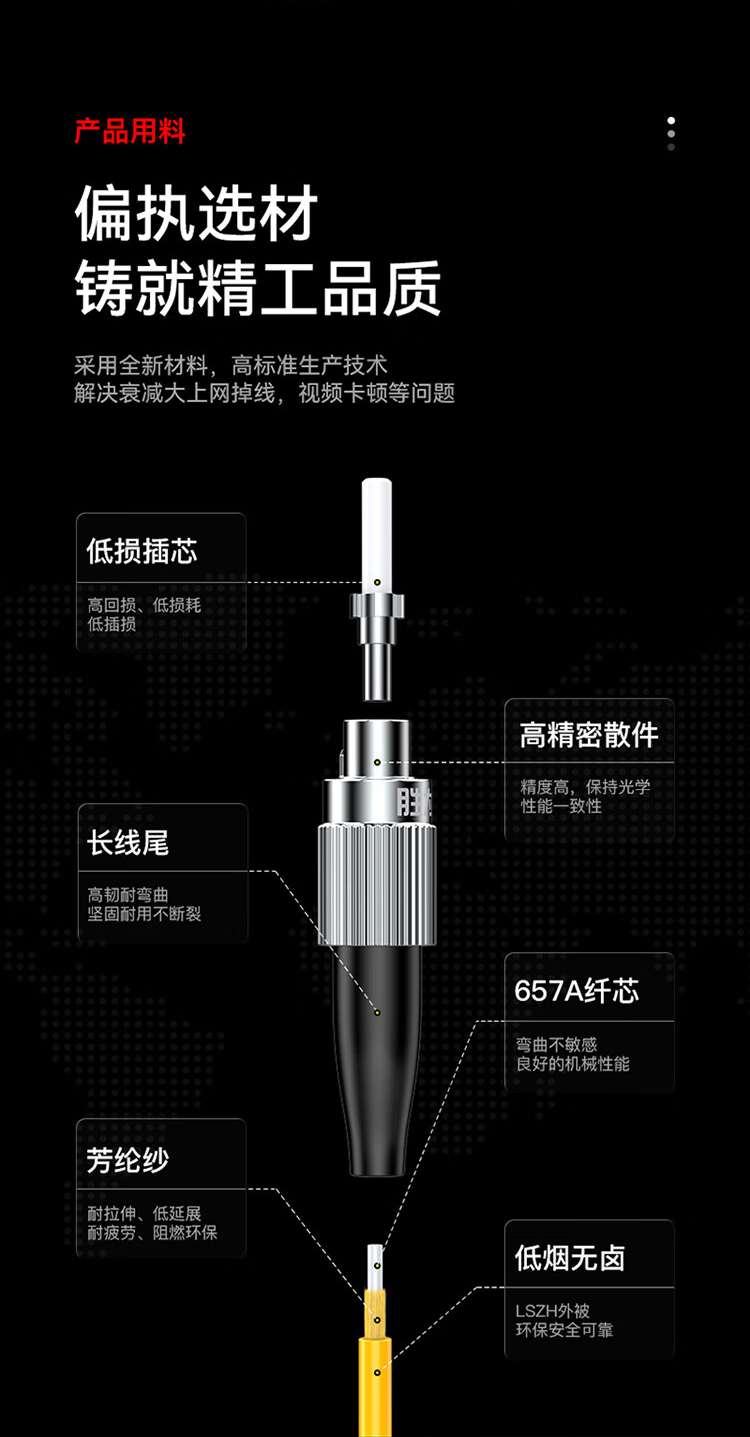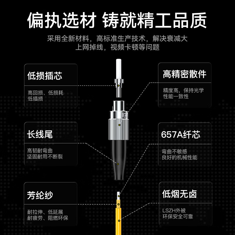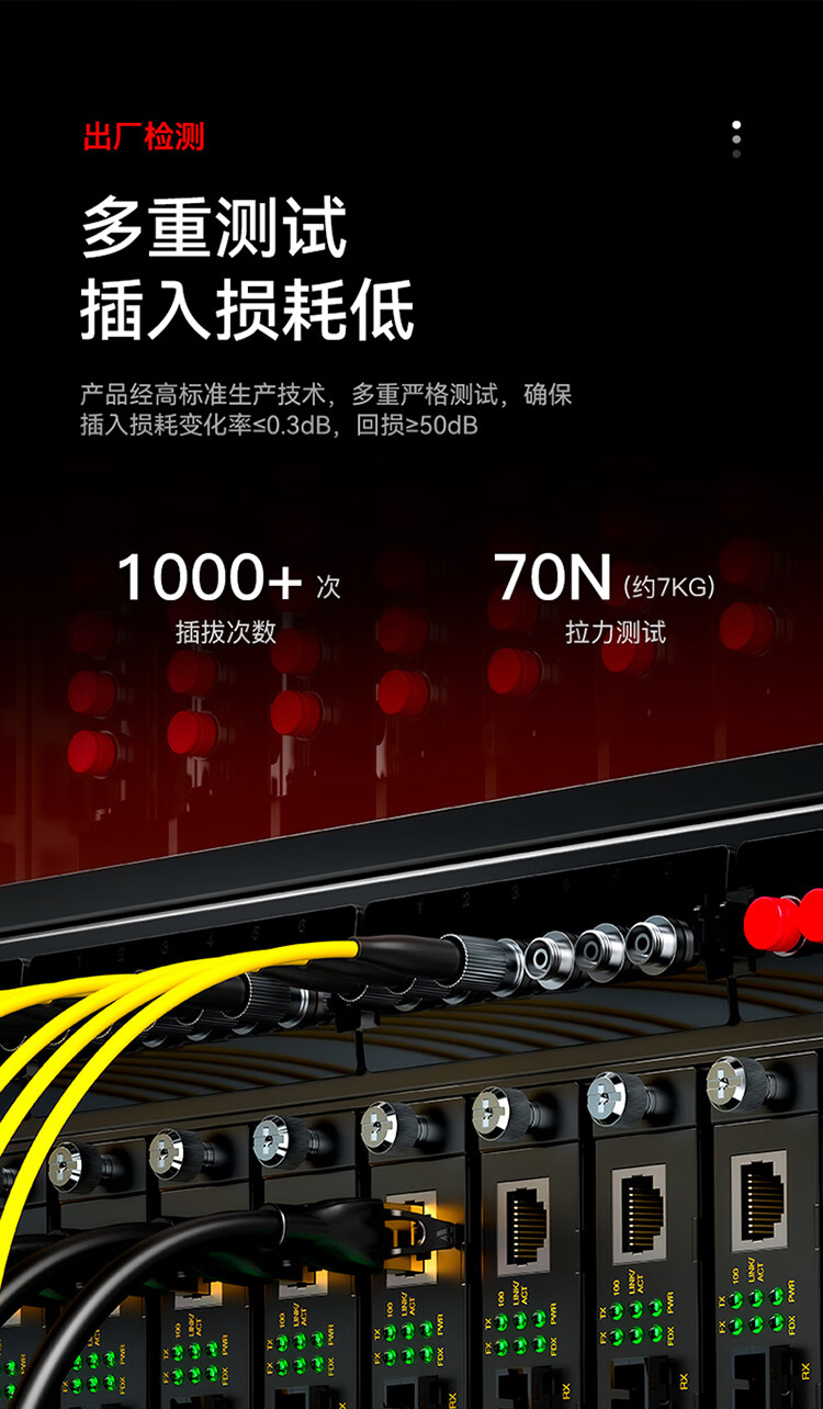 耐插拔次數(shù)高,性能穩(wěn)定可靠;纖芯彎曲不敏感,良好的機(jī)械性能,便于熔接光損小,傳輸快速穩(wěn)定;環(huán)保低煙無(wú)鹵材質(zhì)外被,使用時(shí)間長(zhǎng),耐磨損抗腐蝕,環(huán)保無(wú)異味;多重測(cè)試,