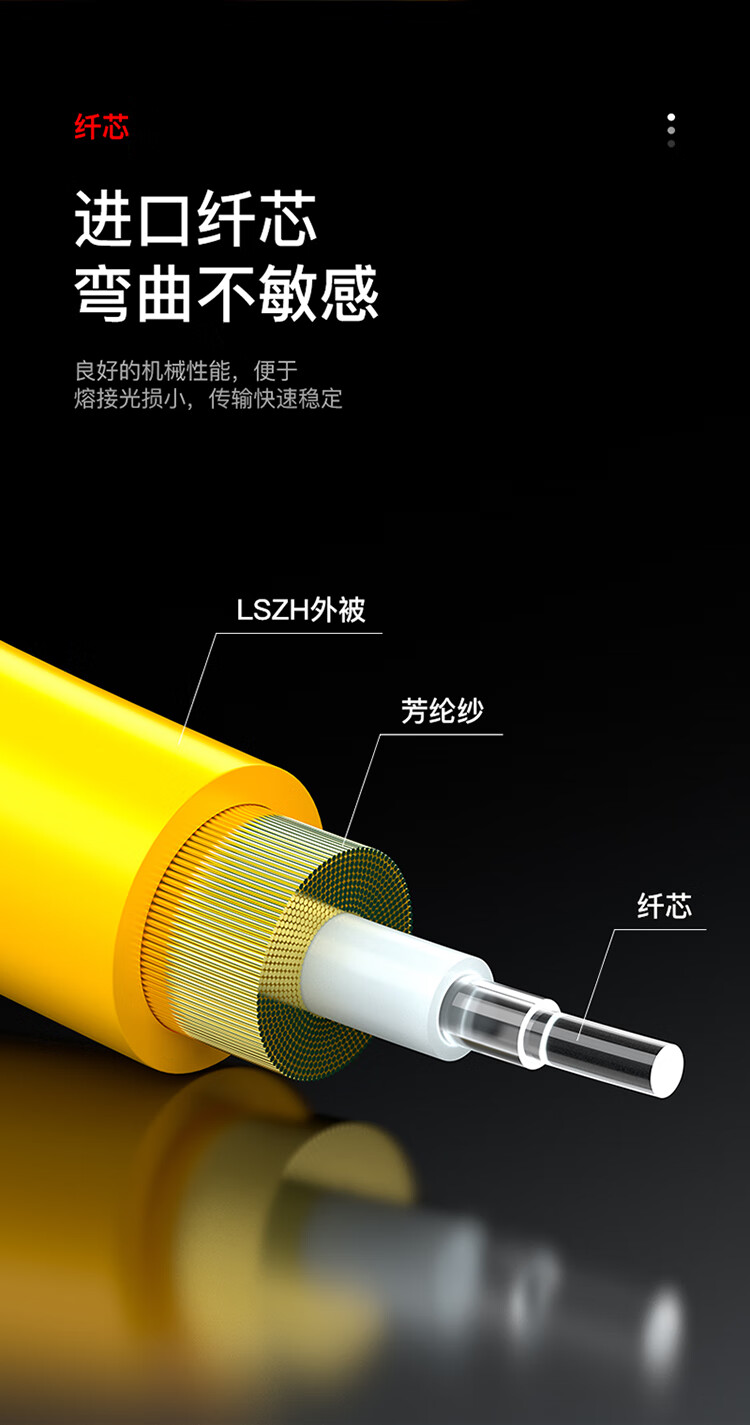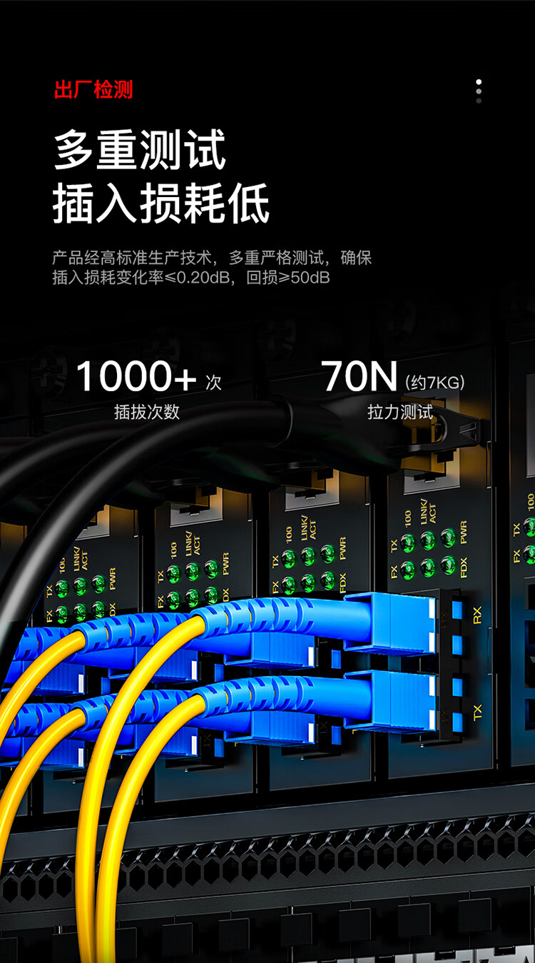 耐插拔次數(shù)高,性能穩(wěn)定可靠;纖芯彎曲不敏感,良好的機械性能,便于熔接光損小,傳輸快速穩(wěn)定;環(huán)保低煙無鹵材質(zhì)外被,使用時間長,耐磨損抗腐蝕,環(huán)保無異味;多重測試,