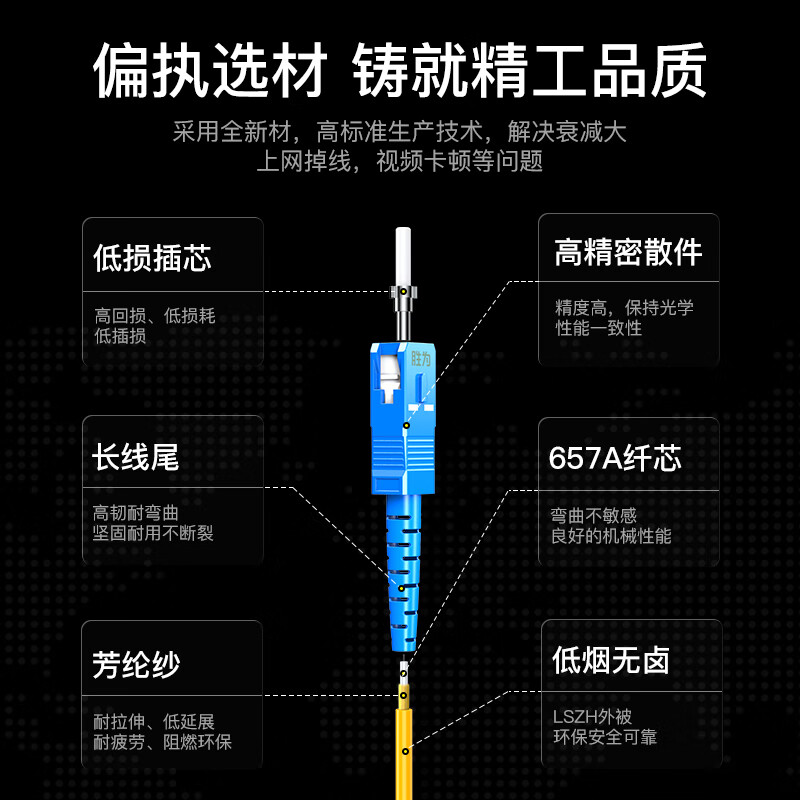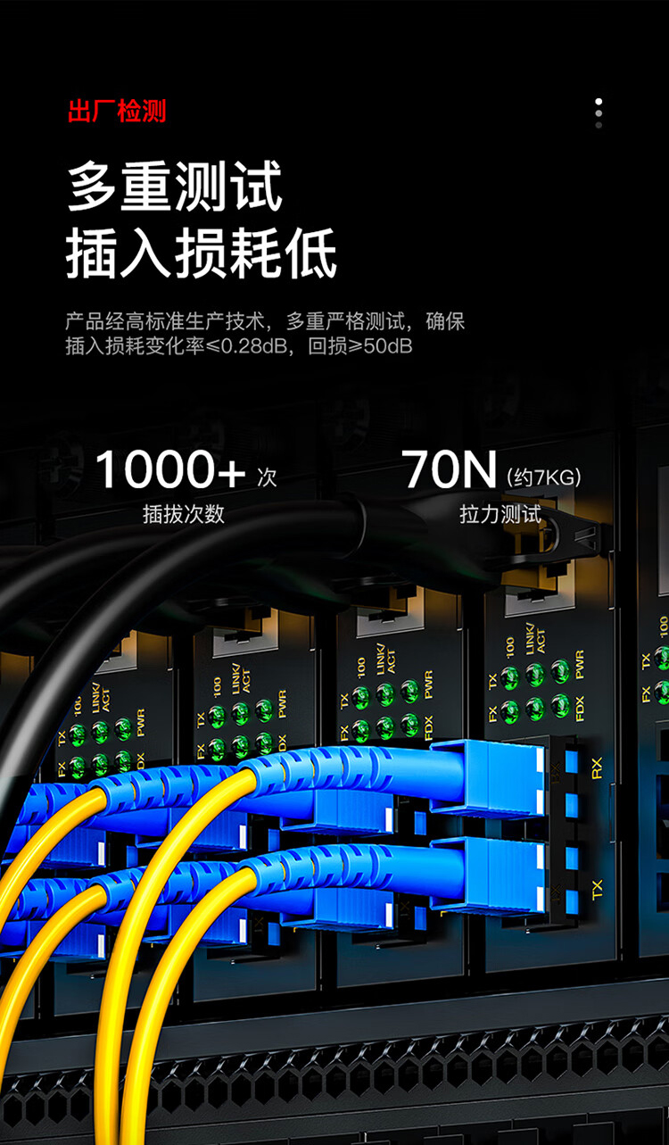 耐插拔次數(shù)高,性能穩(wěn)定可靠;纖芯彎曲不敏感,良好的機(jī)械性能,便于熔接光損小,傳輸快速穩(wěn)定;環(huán)保低煙無鹵材質(zhì)外被,使用時(shí)間長,耐磨損抗腐蝕,環(huán)保無異味;多重測(cè)試,