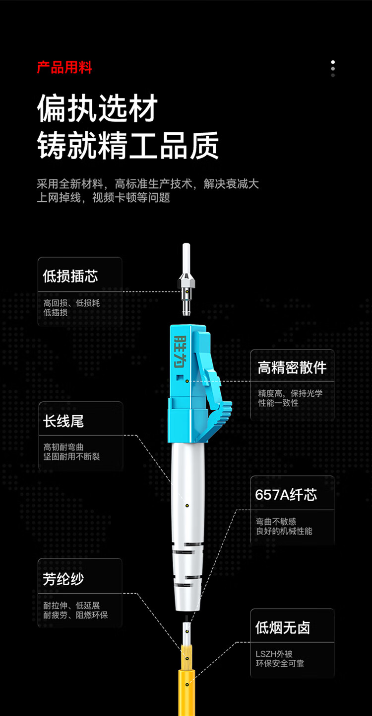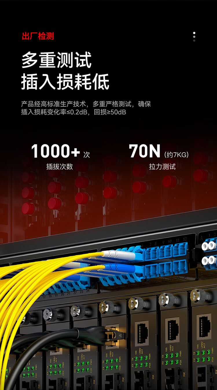 長(zhǎng)線尾保護(hù),堅(jiān)固耐用不斷裂;采用全新高品質(zhì)陶瓷插芯,數(shù)據(jù)互換性穩(wěn)定;耐插拔次數(shù)高,性能穩(wěn)定可靠;纖芯彎曲不敏感,良好的機(jī)械性能,便于熔接光損小,傳輸快速穩(wěn)定;環(huán)保低煙無鹵材質(zhì)外被,使用時(shí)間長(zhǎng),耐磨損抗腐蝕,環(huán)保無異味;多重測(cè)試,插入損耗低,產(chǎn)品經(jīng)高標(biāo)準(zhǔn)生產(chǎn)技術(shù),多重嚴(yán)格測(cè)試,確保插入損耗變化率<0.30dB,回?fù)p≥50dB
