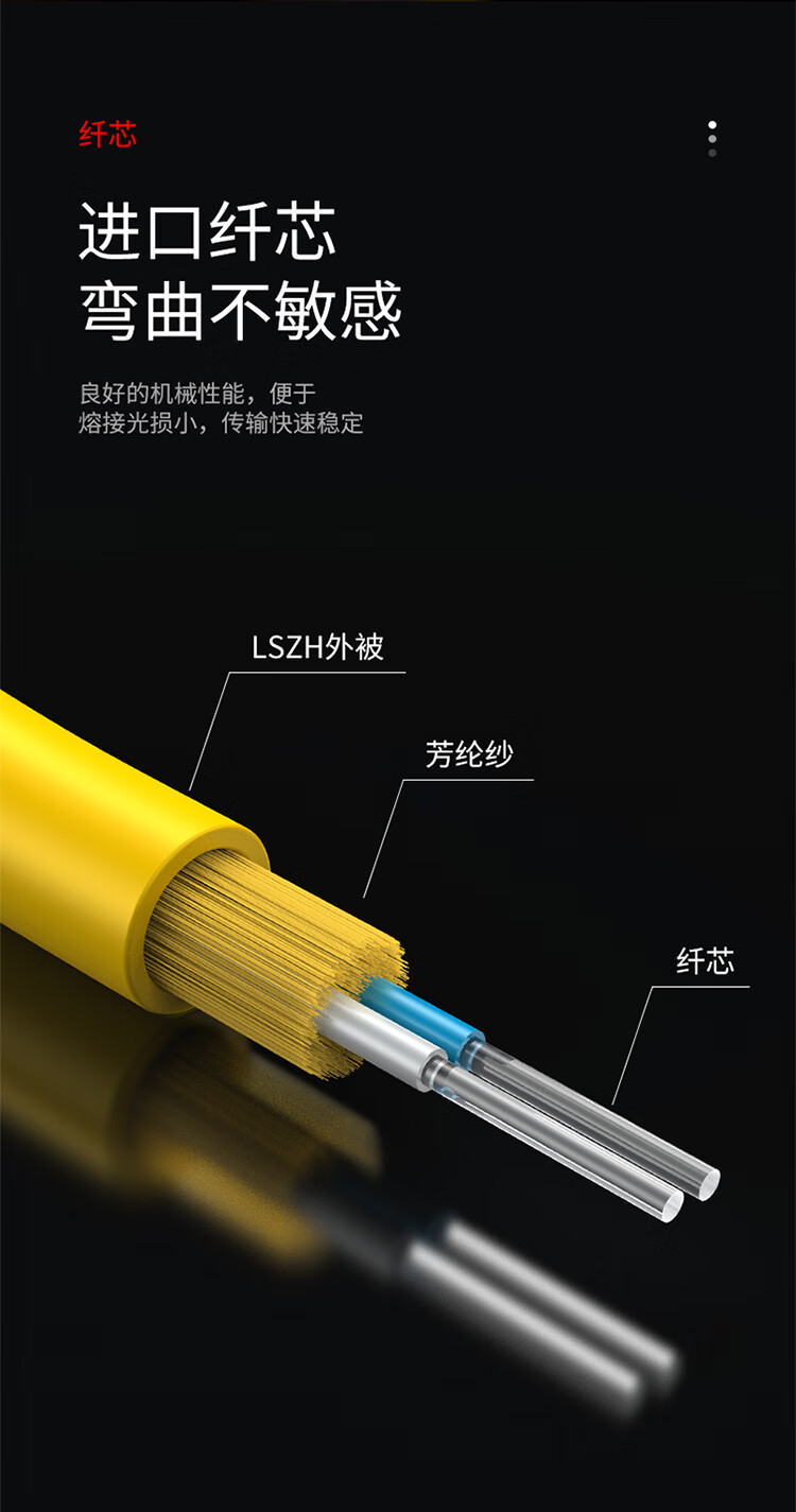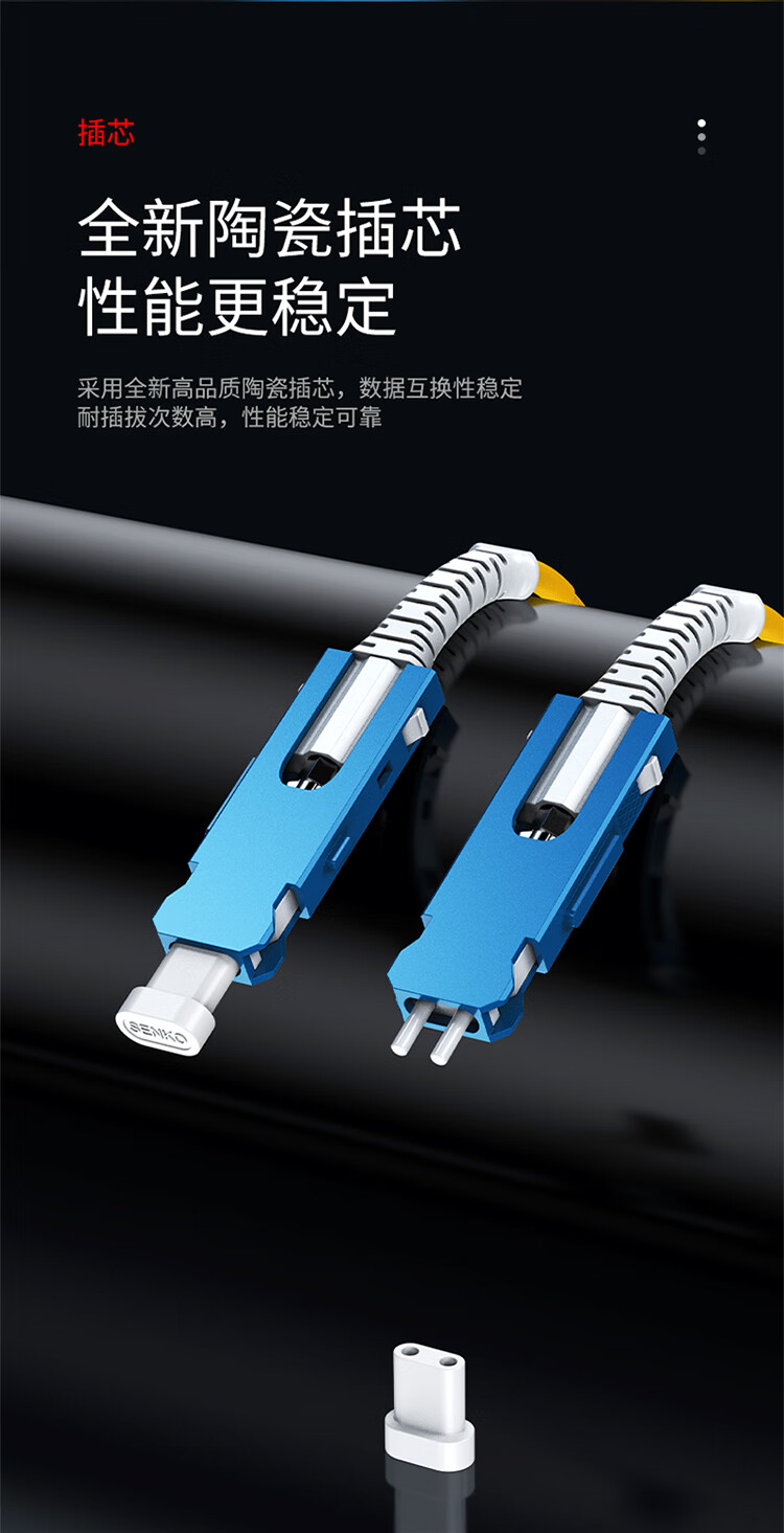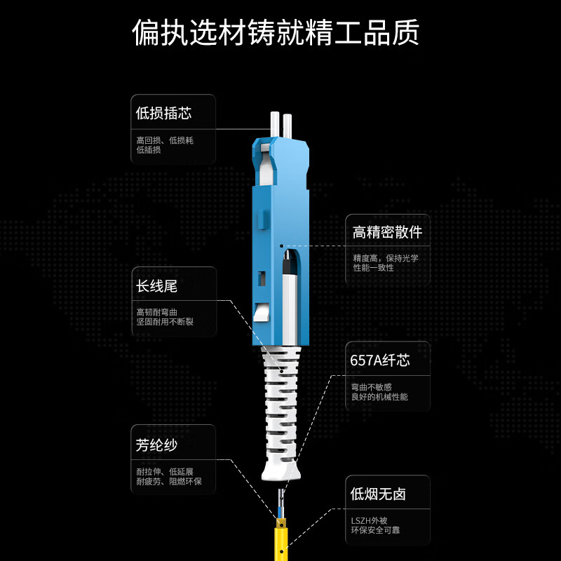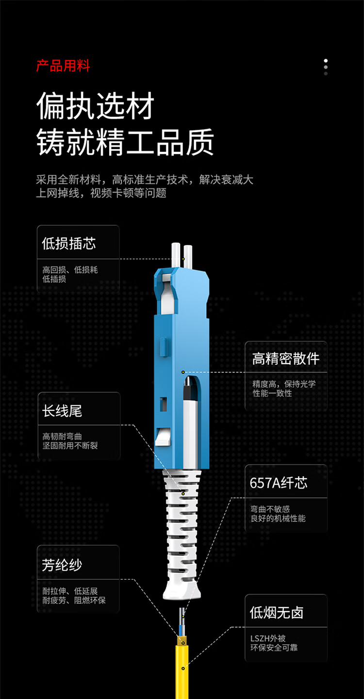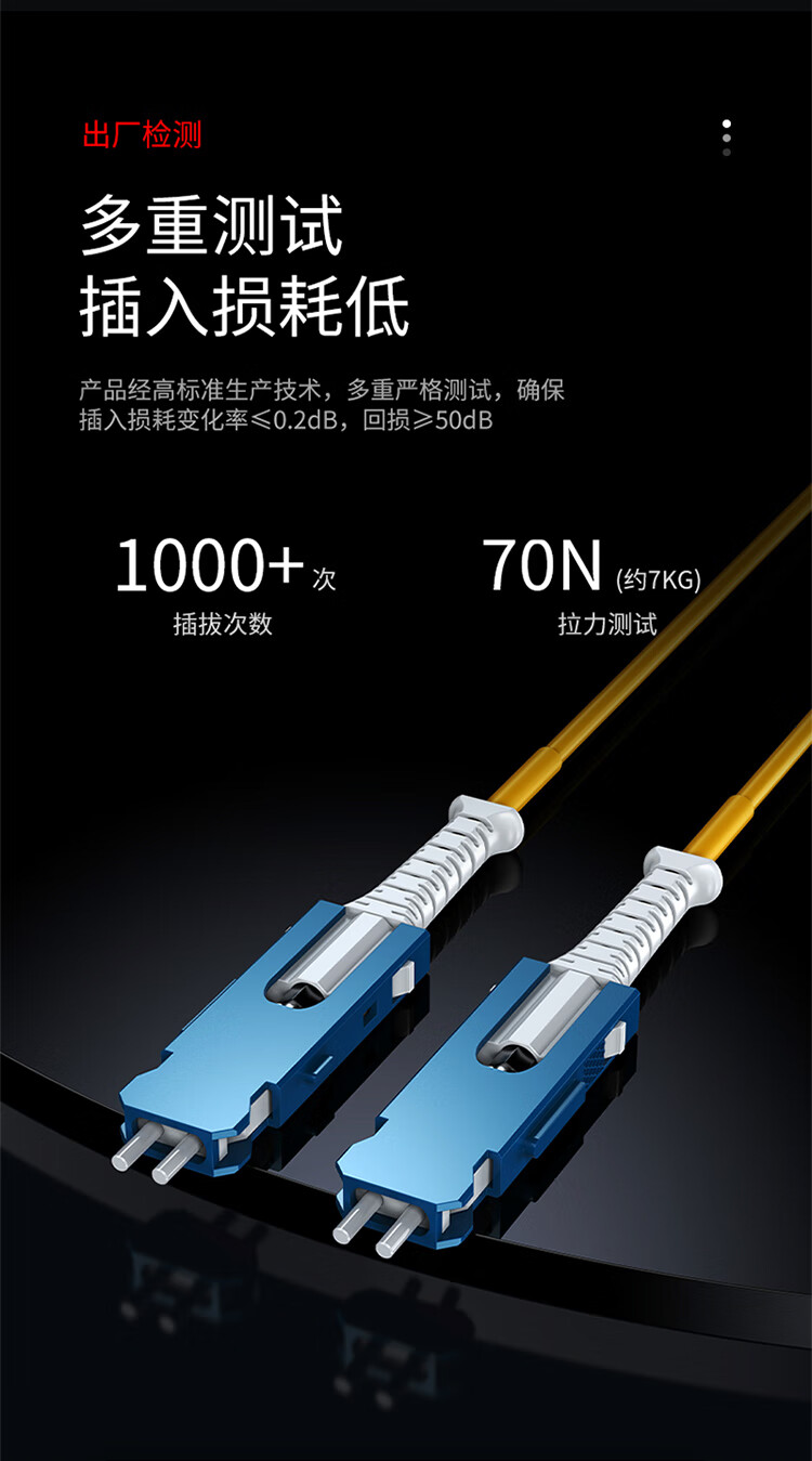 長線尾保護,堅固耐用不斷裂;采用全新高品質(zhì)陶瓷插芯,數(shù)據(jù)互換性穩(wěn)定;耐插拔次數(shù)高,性能穩(wěn)定可靠;纖芯彎曲不敏感,良好的機械性能,便于熔接光損小,傳輸快速穩(wěn)定;環(huán)保低煙無鹵材質(zhì)外被,使用時間長,耐磨損抗腐蝕,環(huán)保無異味;多重測試,插入損耗低,產(chǎn)品經(jīng)高標準生產(chǎn)技術(shù),多重嚴格測試,確保插入損耗變化率<0.20dB,回損≥50dB