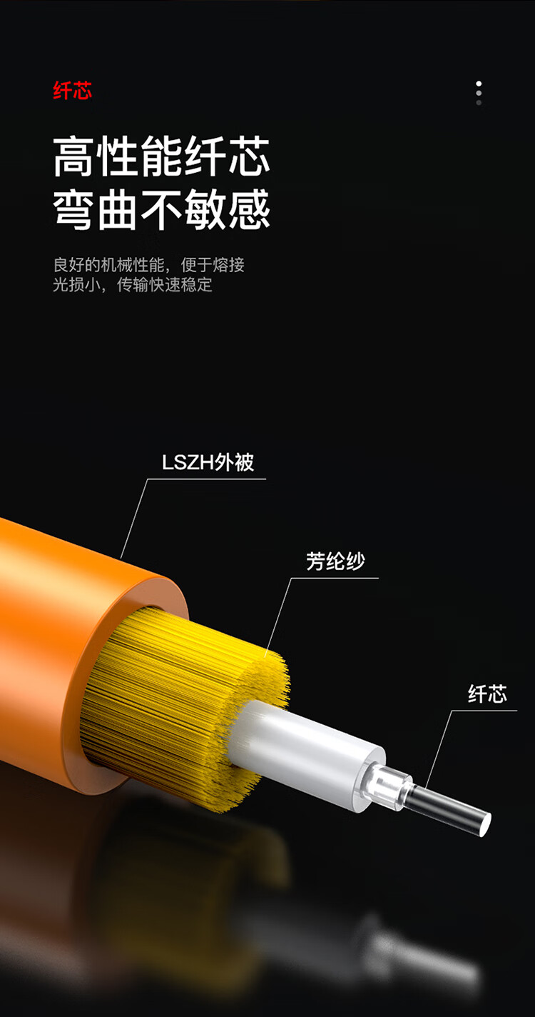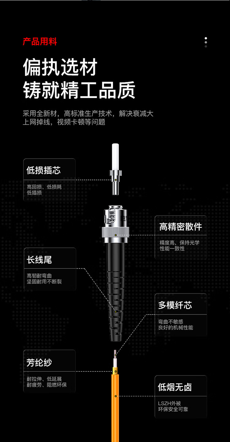 一體工藝,長線尾保護(hù),堅(jiān)固耐用不斷裂;采用高品質(zhì)陶瓷插芯,數(shù)據(jù)互換性穩(wěn)定,耐插拔次數(shù)高,性能穩(wěn)定可靠;纖芯彎曲不敏感,良好的機(jī)械性能,便于熔接光損小,傳輸快速穩(wěn)定;環(huán)保低煙無鹵材質(zhì)外被,使用時(shí)間長,耐磨損抗腐蝕,環(huán)保無異味;多重測(cè)試,插入損耗低,產(chǎn)品經(jīng)高標(biāo)準(zhǔn)生產(chǎn)技術(shù),多重嚴(yán)格測(cè)試,確保插入損耗變化率<0.30dB,回?fù)p≥35dB